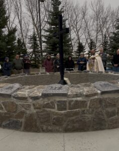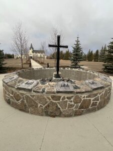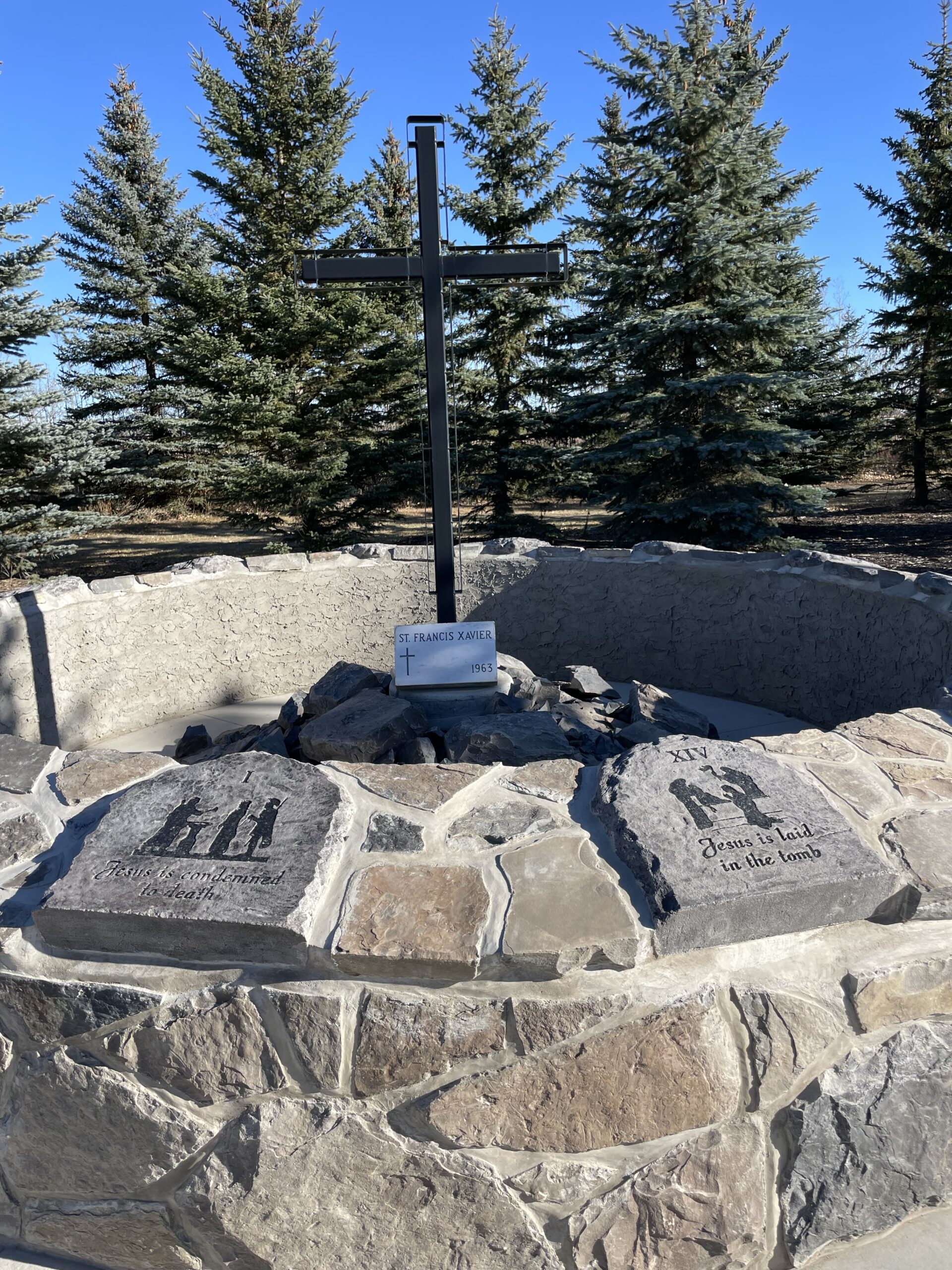 In October of 2024 a proposal was presented to the members of Knights of Columbus council of SFX to fund and build an outdoor Stations of the Cross to be located around the Cross at the east end of the church property. The Cross came from St. Joseph’s Church in Bawlf.